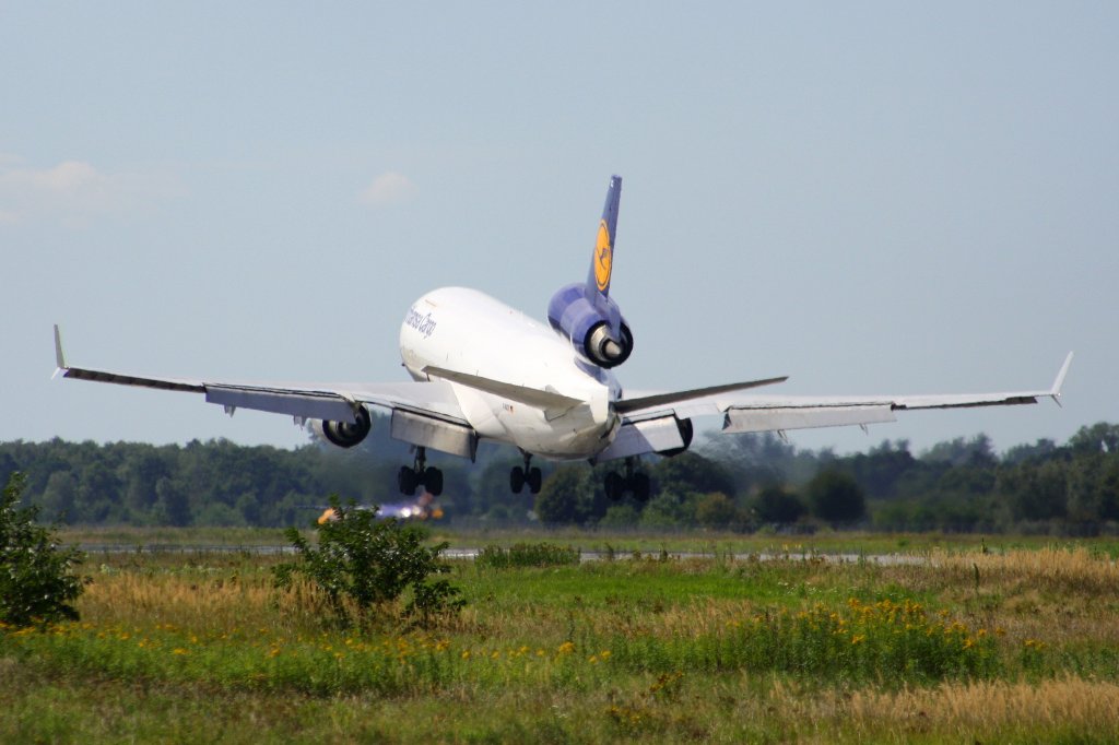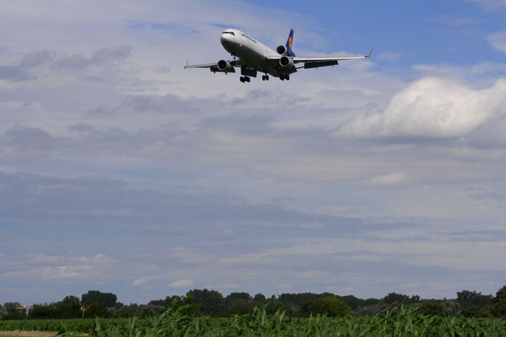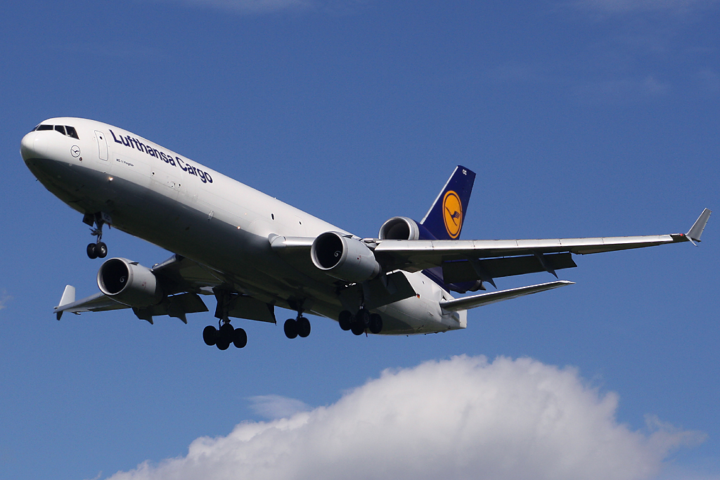 Im Landeanflug auf den Baden-Airpark befindet sich die Lufthansa Cargo-MD-11F D-ALCC (26. August 2010)
