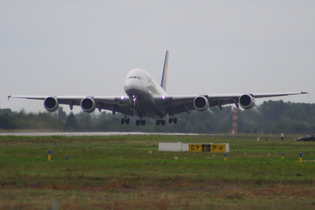 Der neue Lufthansa-Airbus A380-800 D-AIMA bei einem seiner zahlreichen Flugtrainings am Baden-Airpark, hier ist er am 25.08.10 beim Start zu sehen