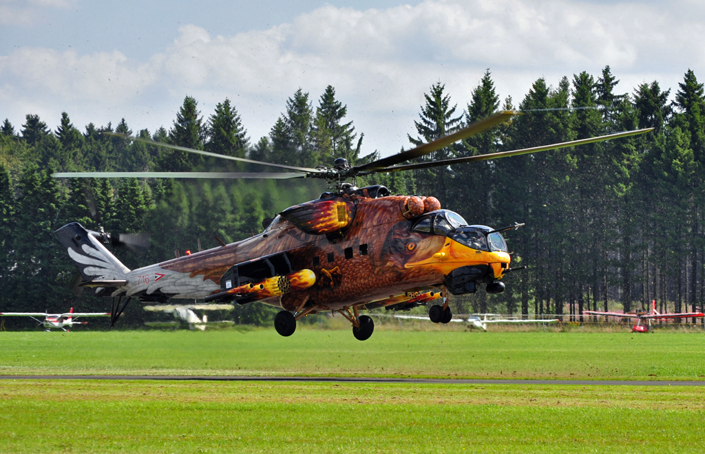 Mi-24 Hind beim Aufsetzen am Flugplatz Breitscheid. Auf diesem Bild ist gut der auflackierte Adler zu erkennen. 21.08.2010