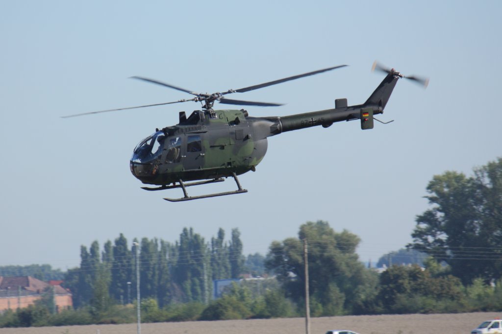Neben dem SeaKing aus Belgien war auch eine Bo-105 der Bundeswehr bei der Air Magdeburg zu Gast. Auf dem Foto ist sie kurz vor dem endgültigen Abflug noch einmal im Tiefflug über den Flugplatz zu sehen. Fotografiert am 06.09.2010.
