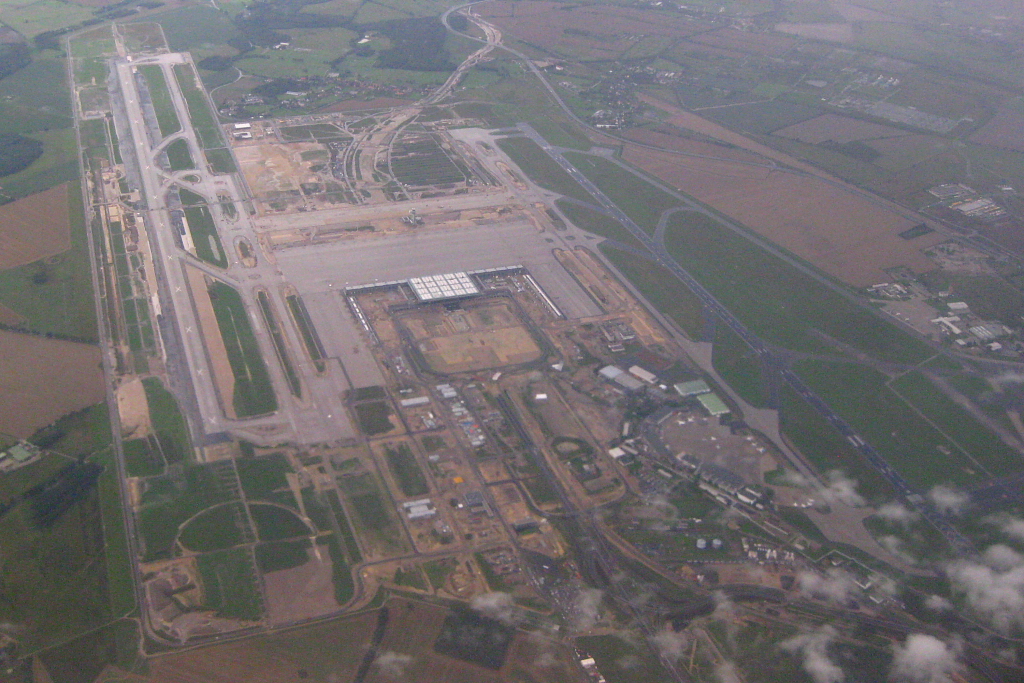 Der zukünftige Flughafen Berlin BBI "WILLY BRANDT" aus der Perspektive einer vorbeifliegenden Airberlin-Boeing 737-700 am 16. August 2010