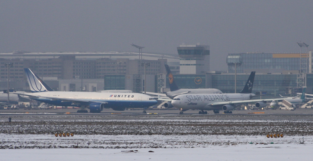 Rush-Hour in Frankfurt: Ein Airbus A340-300 der Lufthansa und eine Boeing 777 der United Airlines beim Taxiing (04.01.11)