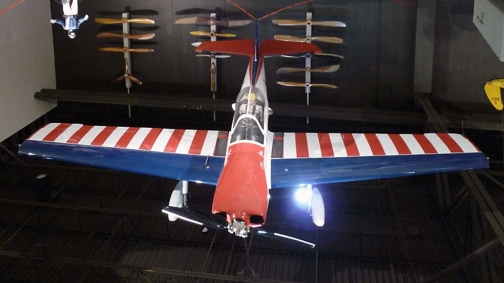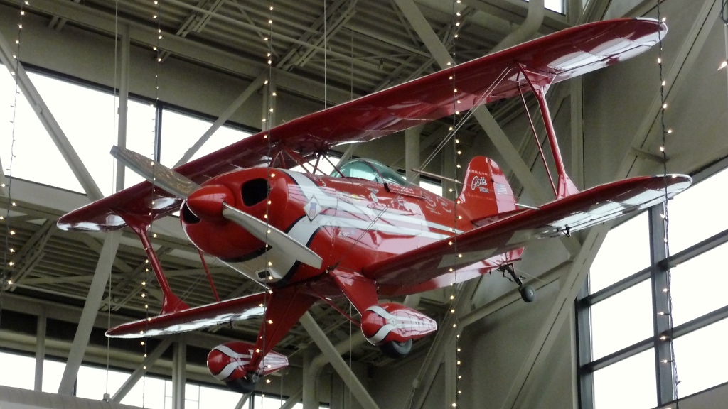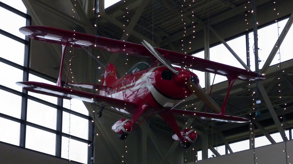 Hoch über den Köpfen hängt eine weitere Pitts Special S1T der "Red Devils" im Eingangsbereich des EAA Airventure Museums in Oshkosh, WI (3.12.10).