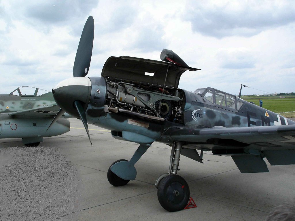 Me-109, mit ca 34.500 Stück das meistgebaute Jagdflugzeug der Geschichte, von der Firma Messerschmitt in Deutschland, Erstflug 1935, gesehen zur ILA 2006 in Berlin, hier mit geöffnerer Motorhaube,