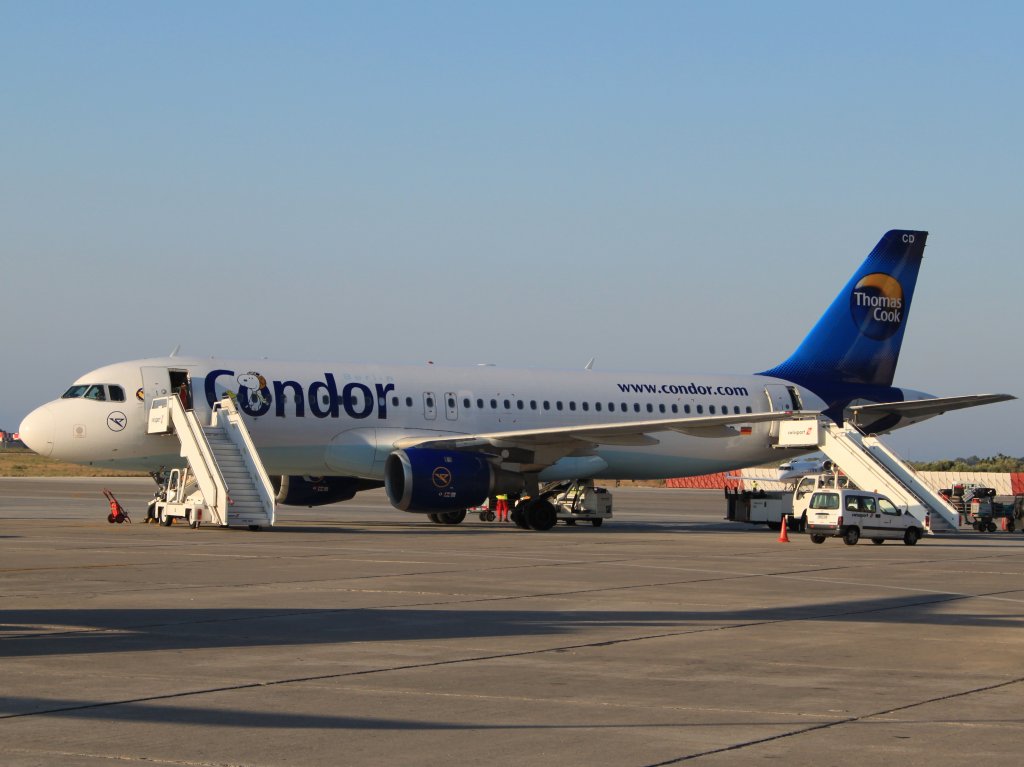 Airbus A 320-212 D-AICD von Condor am Abend des 30.06.2011 am Flughafen von Rhodos (GR).