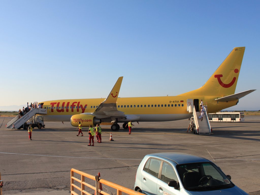 B 737-8K5 D-ATUI von Tuifly am Abend des 30.06.2011 am Flughafen von Rhodos (GR).