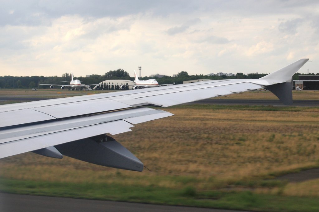 Blick kurz vor dem Start in Berlin-Tegel am 19.06.11 aus dem Fenster des Airbus A321-100 der Lufthansa. Beim Vorfeld in "Tegel-Süd" stehen zwei japanische Boeing 747.