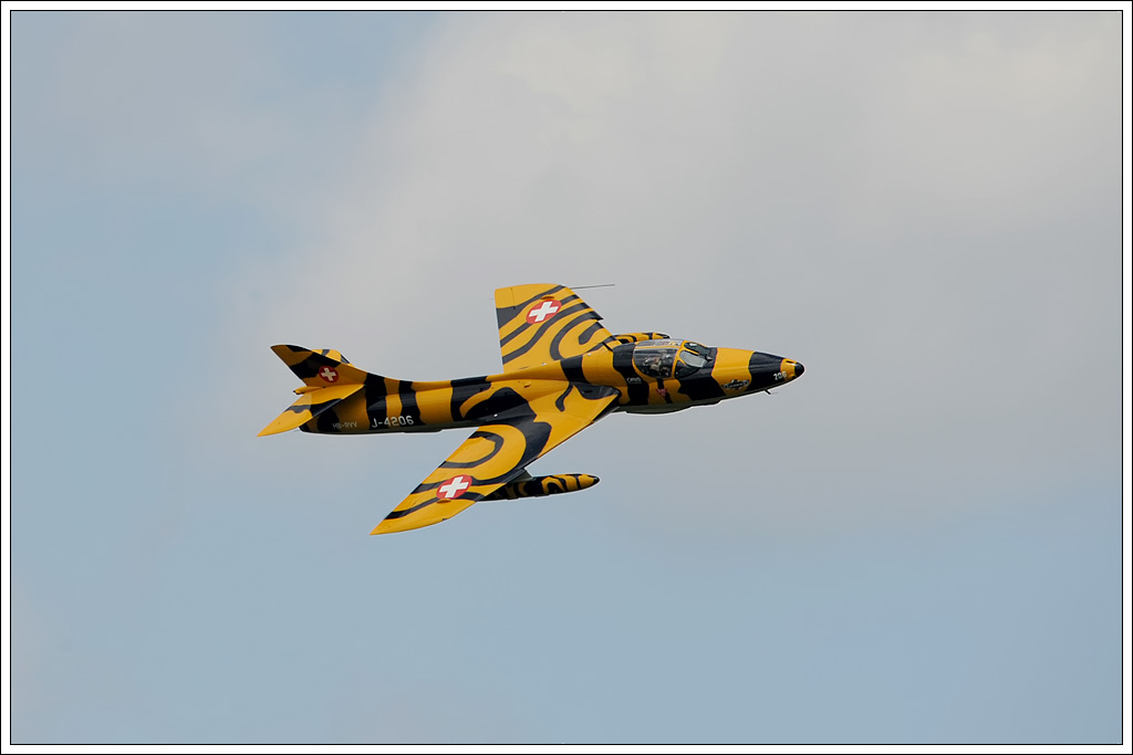 Der Hawker Hunter T.MK.68, HB-RVV (J-4206) "Double Victory" des Fliegermuseums Altenrhein präsentiert sich seit dem Jahr 2009 in einer Tiger-Bemalung. Damit wurde ein Anstrich wieder aufgegriffen, der bereits vor 35 Jahren einmal einen Hawker Hunter der Schweizer Luftwaffe geziert hatte. airpower 2011 - Zeltweg/Steiermark/Österreich