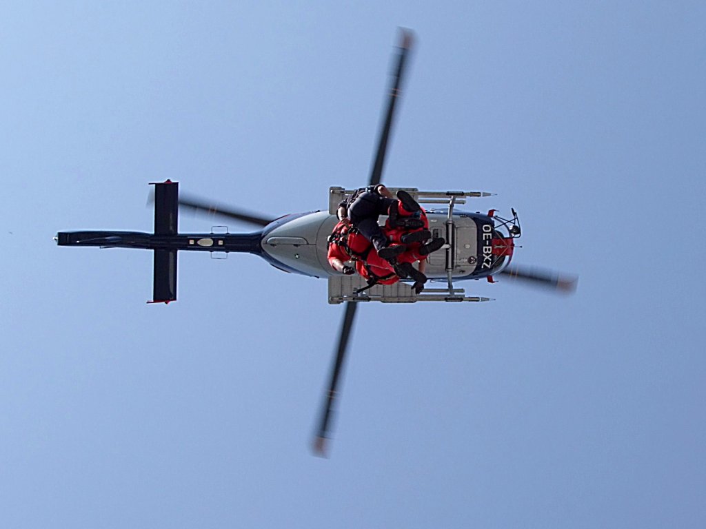 EC135 (Polizeihubschrauber) demonstriert anlässlich der Rot-Kreuz-Übung "Innpower2011" eine Seilrettung;110604