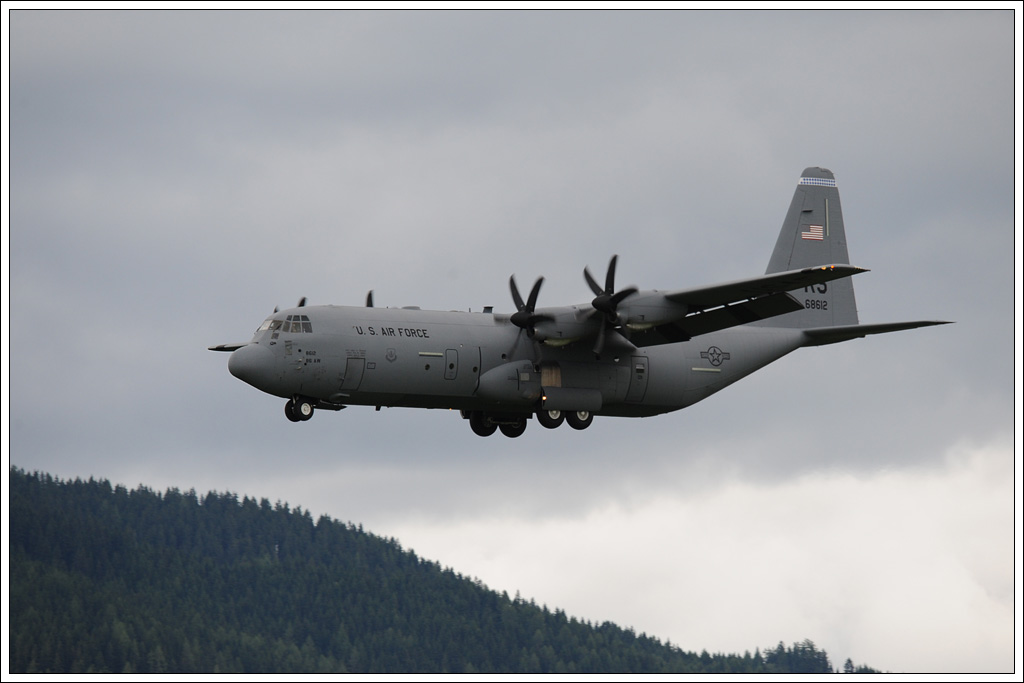 Lockheed C-130 "Hercules". Die USAFE (United States Air Forces in Europe) zeigte im static Display der AIRPOWER11 eine Lockheed Martin C-130J Super Hercules - die bisher jüngste Weiterentwicklung der C-130 und einzige Variante, die derzeit noch gefertigt wird. Äußerlich ist sie der klassischen Hercules zwar ähnlich, besitzt jedoch unter anderem neue Turboprop-Triebwerke, 6-Blatt-Propeller sowie digitale Avionik. Die Aufnahme entstand einen Tag vor der offiziellen Airpower 2011 am 30.6.2011, und zeigt die Maschine beim Landeanflug in Zeltweg.