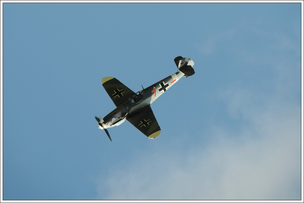 Messerschmitt Bf (Me) 109 "Rote Sieben" am 1.7.2011 bei der Airpower in Zeltweg. Die Bf-109 G-4 "Rote Sieben", die heute im Besitz von EADS ist, wurde 1958 als HA 1112 M-1L in Spanien gefertigt.