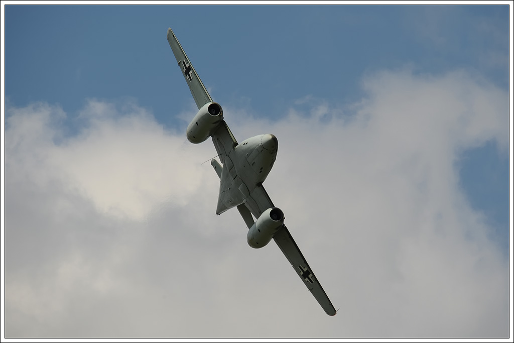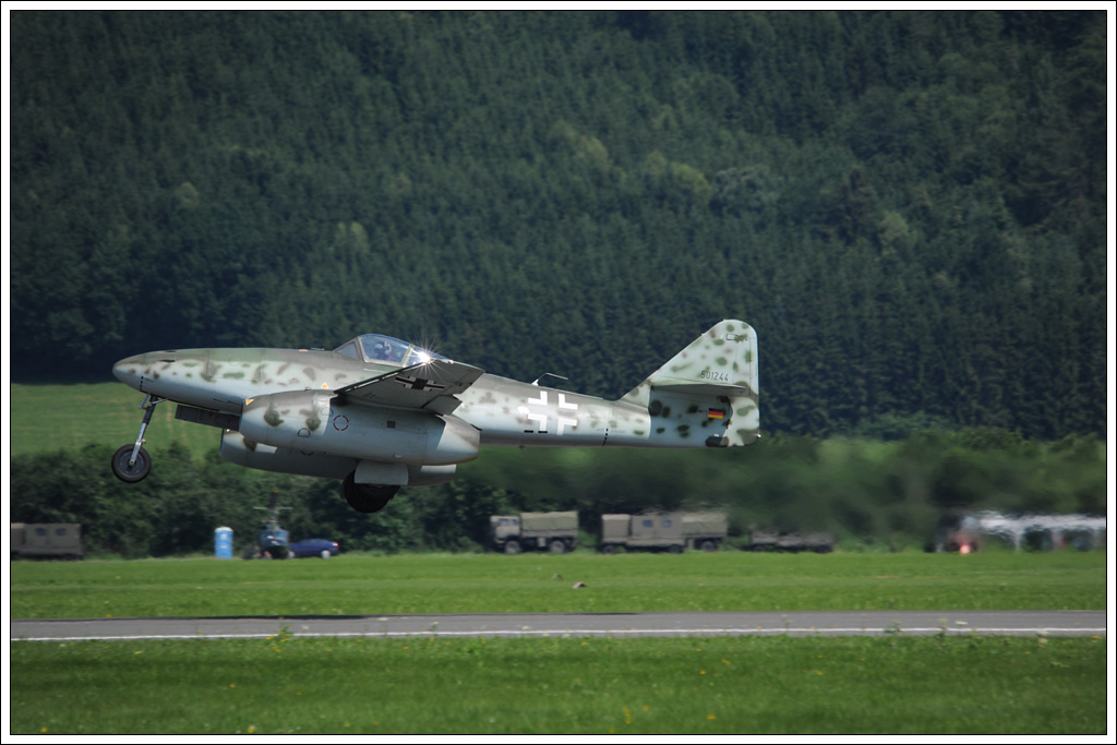 Messerschmitt Me 262 beim Start in Zeltweg am 1.7.2011. Auf der AIRPOWER11 ist eine Me 262 B-A1 ("D-IMTT", Werknummer 501244) zu sehen. Sie ist eine von fünf Nachbauten, die ab 1993 mit Hilfe einer originalen doppelsitzigen Schulmaschine Me 262 B – einer Leihgabe der US Navy – in Texas konstruiert wurden. Die "TangoTango" gehört der deutschen Messerschmitt-Stiftung und hatte 2005 in Seattle ihren Jungfernflug, bevor sie wieder zerlegt und nach Deutschland transportiert wurde. Im Mai 2006 präsentierte sie sich dann auf der ILA in Berlin-Schönefeld erstmals einem europäischen Publikum.