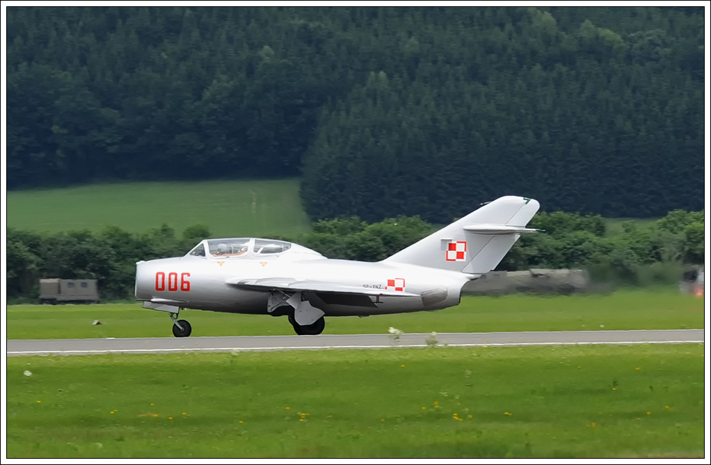 MiG-15 bei der Landung in Zeltweg am 1.7.2011. Das auf der AIRPOWER11 gezeigte Exemplar war eine in Lizenzbau hergestellte polnische SB Lim-2 aus dem Jahr 1956. Der zweisitzige Strahltrainer wurde von der Stiftung Fundacja Polskie Orly in dreijähriger Arbeit restauriert und ist europaweit das einzige flugfähige Exemplar seiner Art aus polnischer Fertigung.