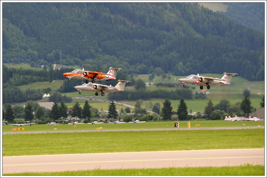 Schwarm-Formation Saab 105OE durch die Düsentrainerstaffel des Überwachungsgeschwaders des ÖBH beim Start in Zeltweg am 1.7.2011