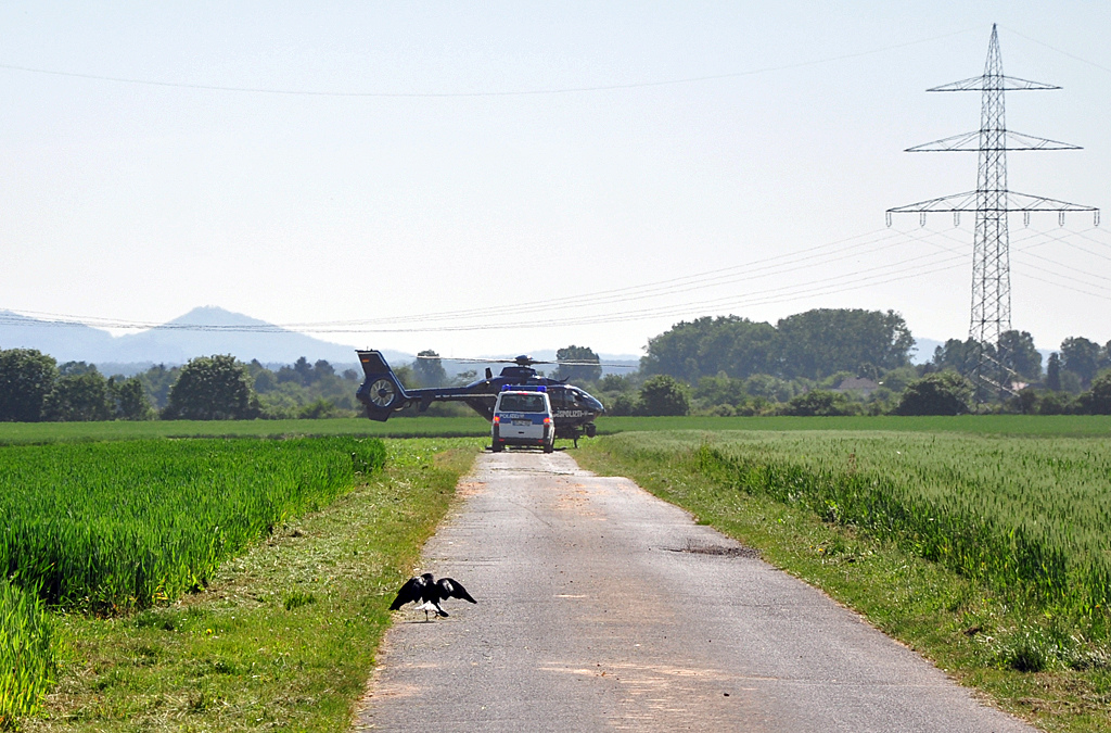 EC 135 der Bundespolizei bei einer Außenlandung im Kreis Euskirchen, argwöhnisch beobachtet von einem "ortsansässigen" Raben - 25.05.2011
