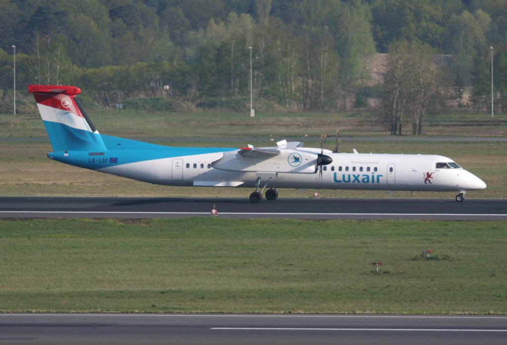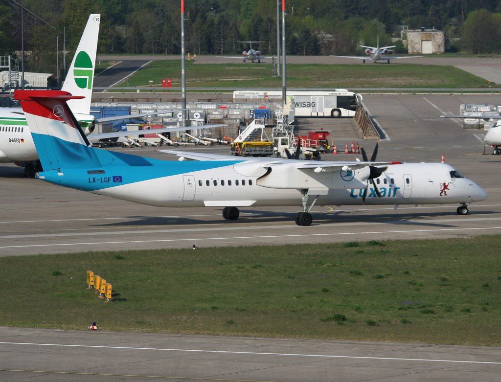 Luxair De Havilland Canada DHC-8-402Q LX-LGF auf dem Weg zum Start in Berlin-Tegel am 21.04.2011