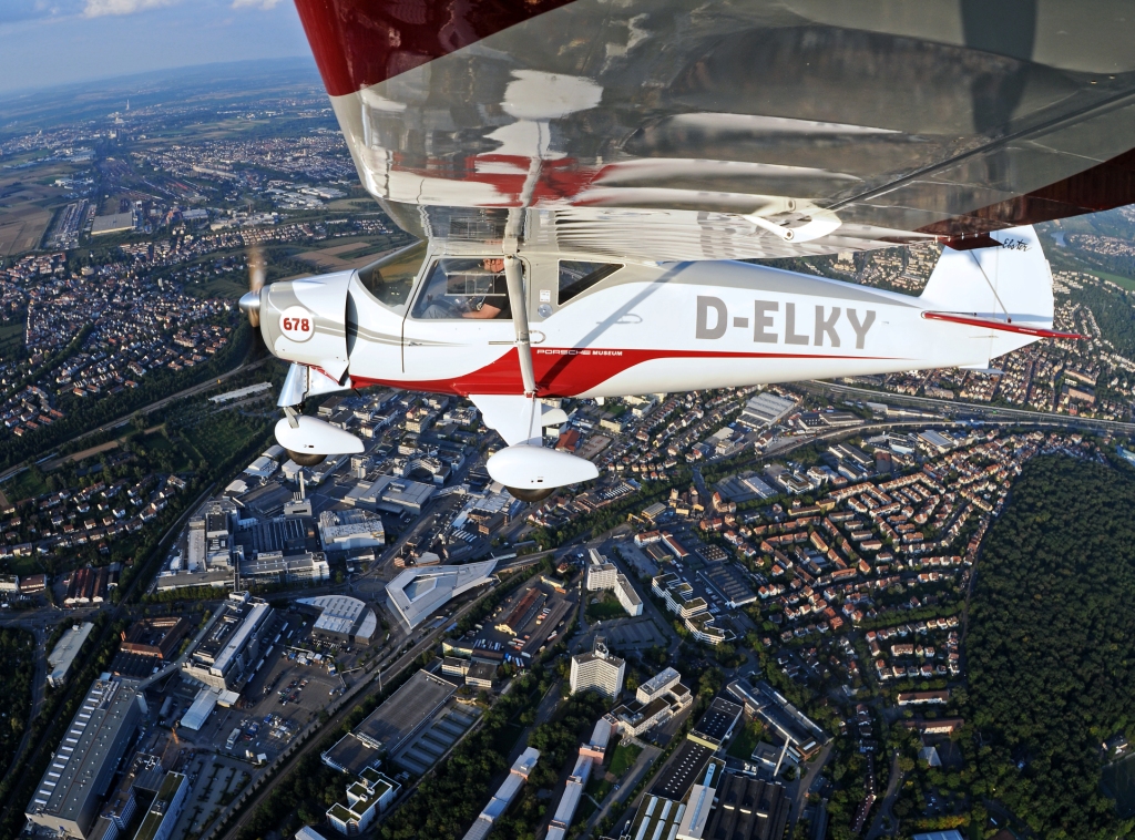 Mit der Pützer Elster B über PORSCHE-Land. Hier über Stuttgart-Zuffenhausen. Unterhalb des Fahrwerks ist das PORSCHE MUSEUM zu erkennen, dessen "Fliegender Botschafter" die Elster ist. Ausführliche Infos auf www.elster-porschemuseum.de