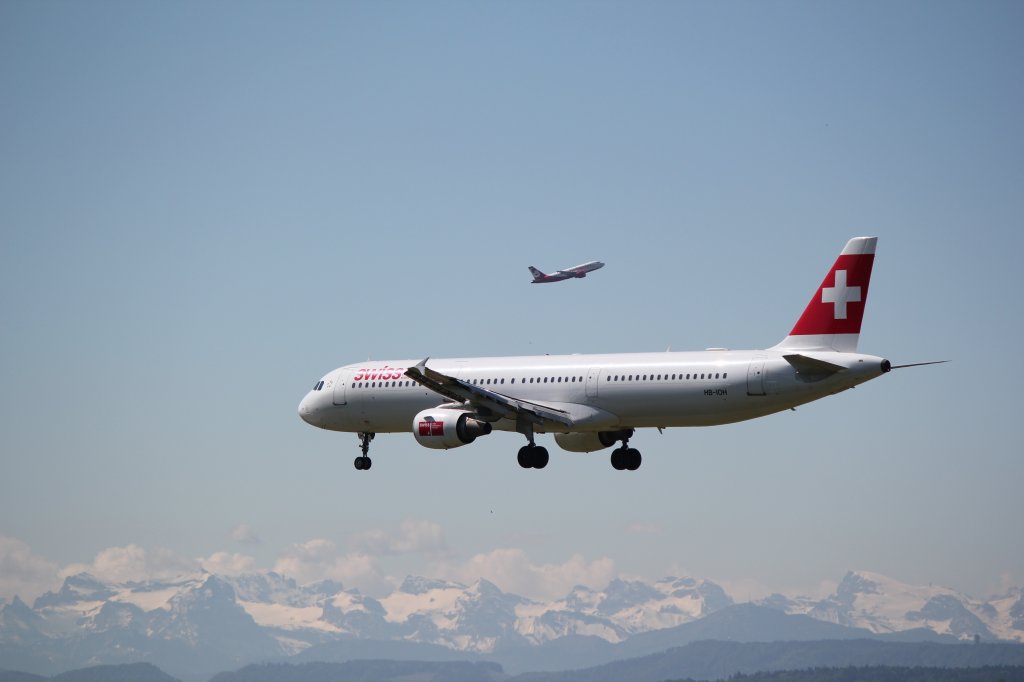 Swiss A321-111 im Anflug auf Zürich-Kloten am 18.5.2011. Im Hintergrund sind die Alpen und ein Airbus von AirBerlin zu sehen.