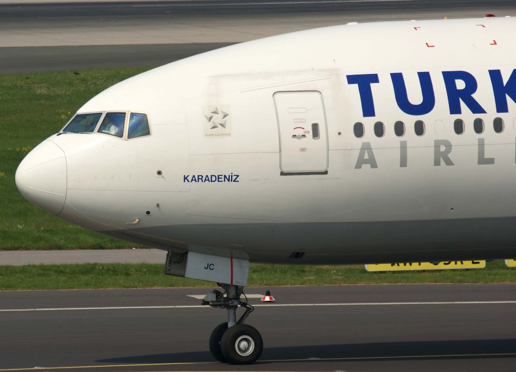 Turkish Airlines, TC-JJC, Boeing 777-300 ER "Karadeniz" (Manchester United-Sticker ~ Nase/Nose), 29.04.2011, DUS-EDDL, Düsseldorf, Germany