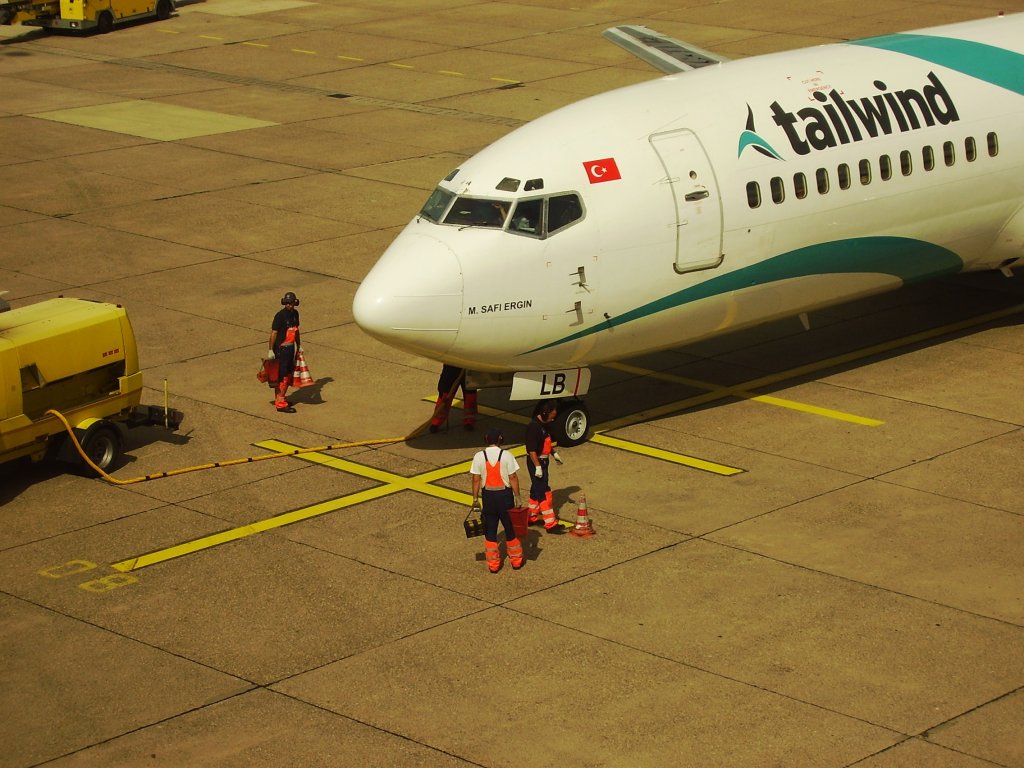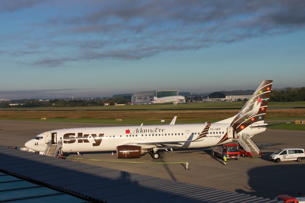 Boeing 737-900 ER von sky steht in Friedrichshafem am Gate. Diese Boeing wird in kürze nach Antalya starten. Aufgenommen am 10.09.2011 in Friedrichshafen