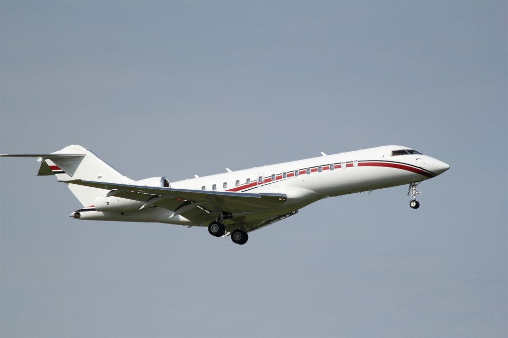 Silver Arrows Bombardier BD-700-1A10 Global Express im Anflug auf Piste 14 in Zürich-Kloten am 21.8.2011.