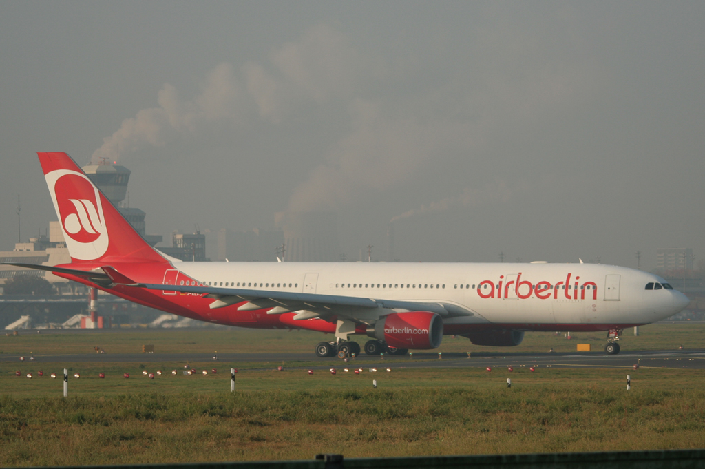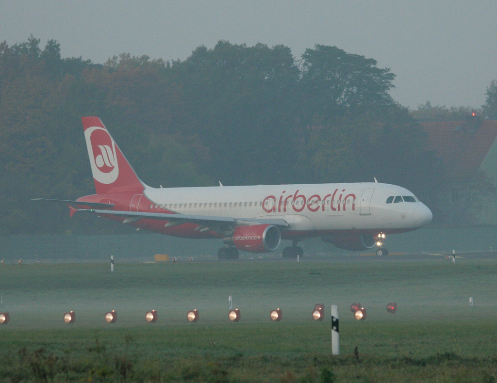 Air Berlin A 320-214 D-ABFN kurz vor dem Start in Berlin-Tegel an einem sehr trüben Morgen des 29.10.2011