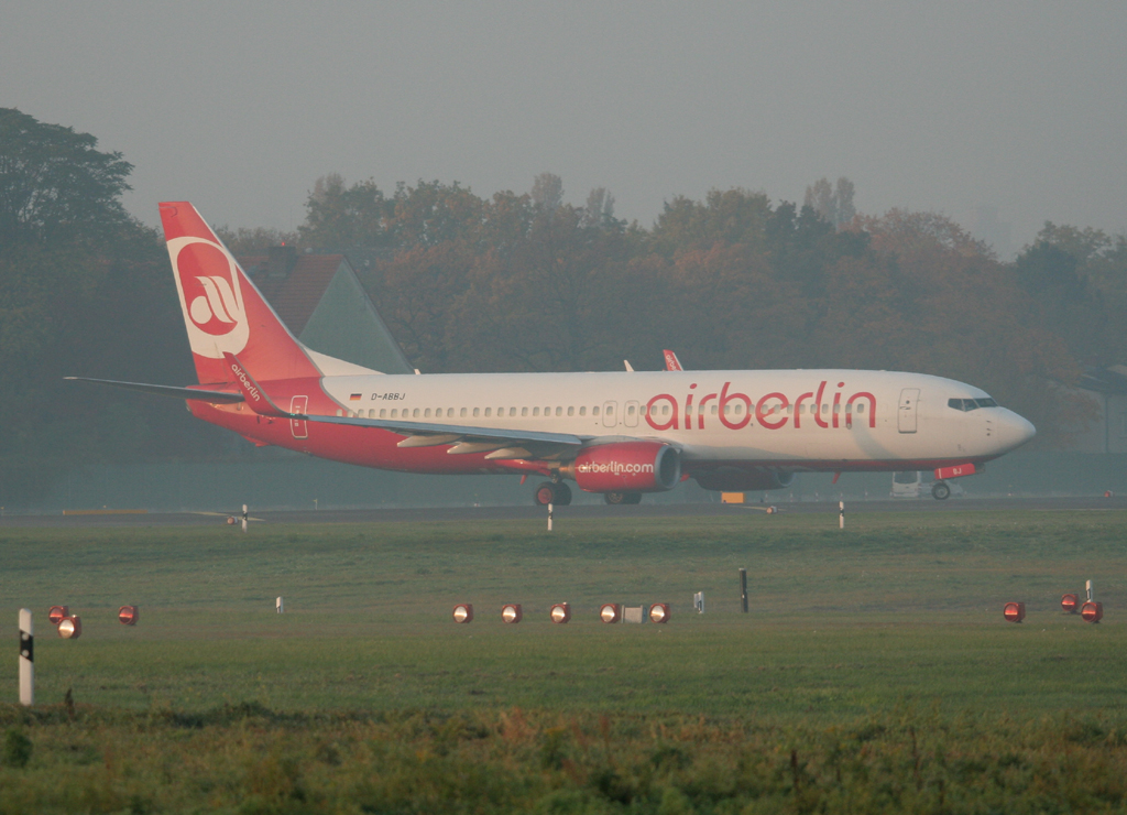 Air Berlin B 737-86Q D-ABBJ kurz vor dem Start an einem sehr trüben Morgen des 29.10.2011 in Berlin-Tegel