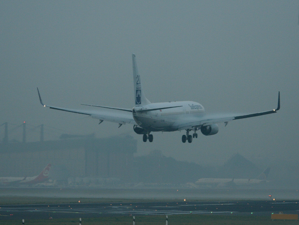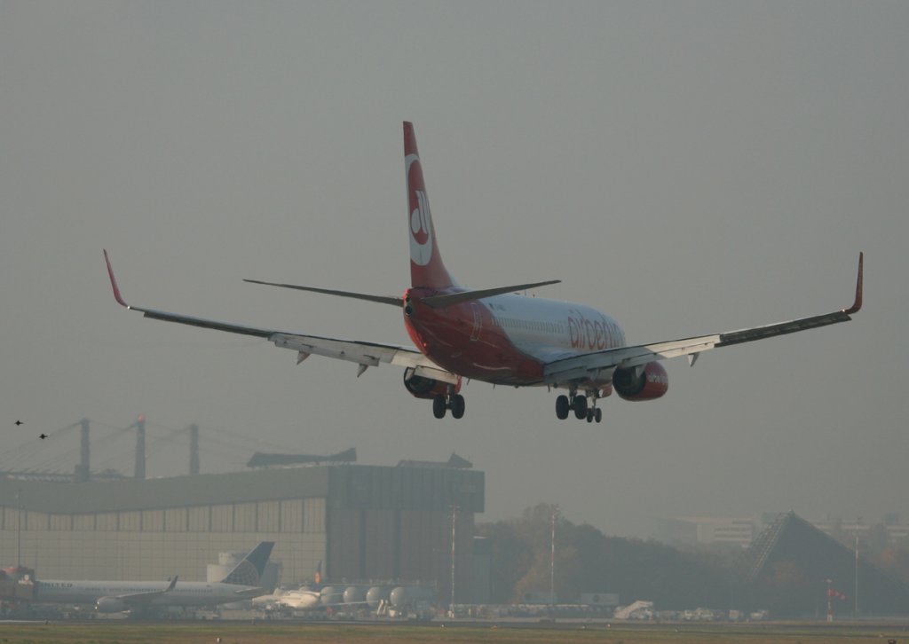 Air Berlin B 737-86J D-ABBG bei der Landung in Berlin-Tegel an einem sehr trüben Morgen des 29.10.2011