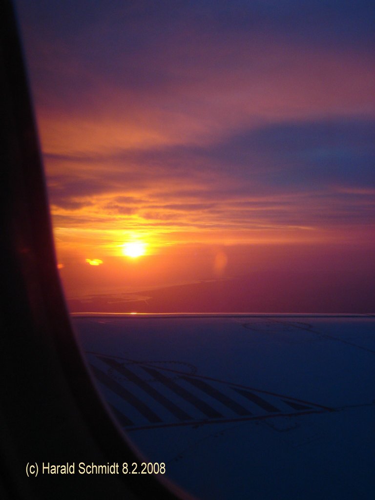 Flug in den Sonnenuntergang am 8.2.2008: von Kopenhagen nach Hamburg, über Schleswig-Holstein zu Landung in Hamburg von Westen her, das silberne Band am Horzont ist die Elbe.