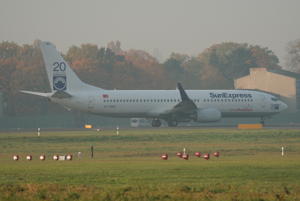 SunExpress B 737-8HC TC-SNG bei der Landung an einem sehr trüben Morgen des 29.19.2011 in Berlin-Tegel