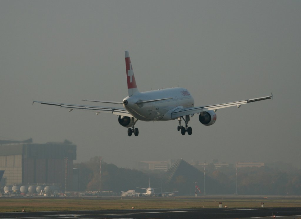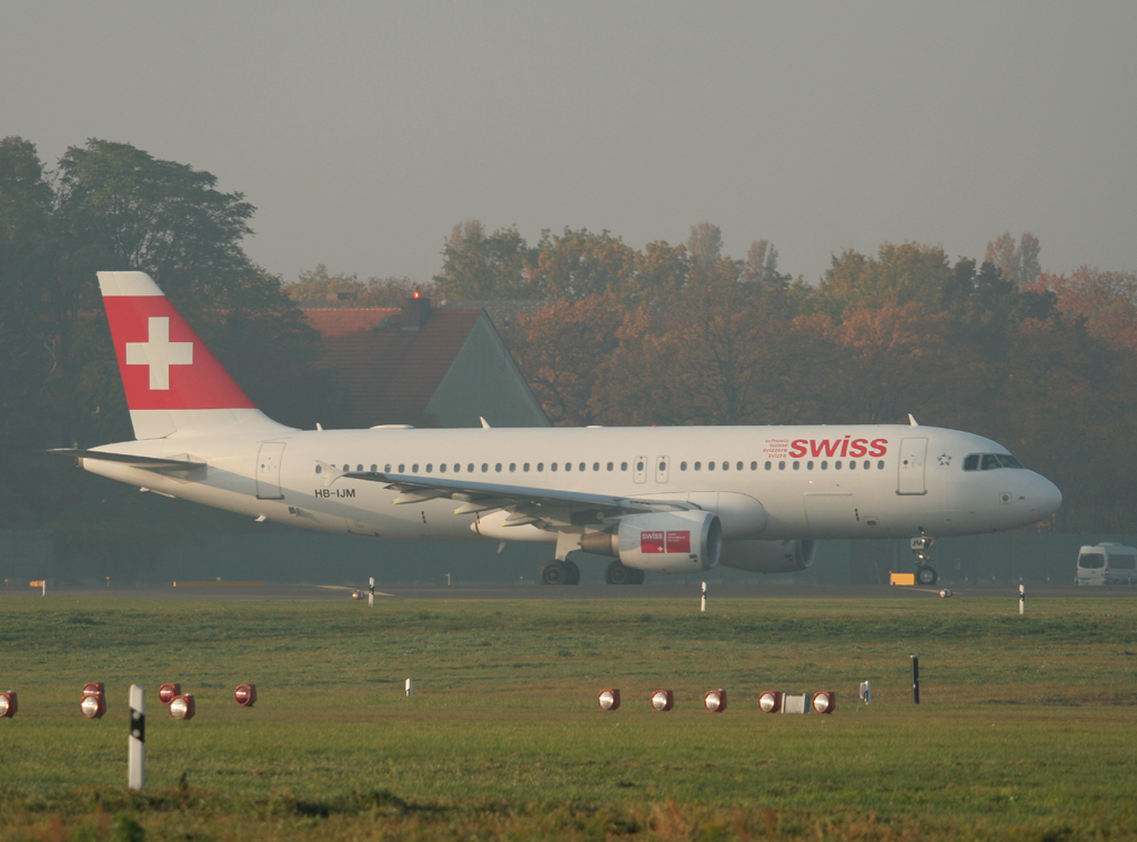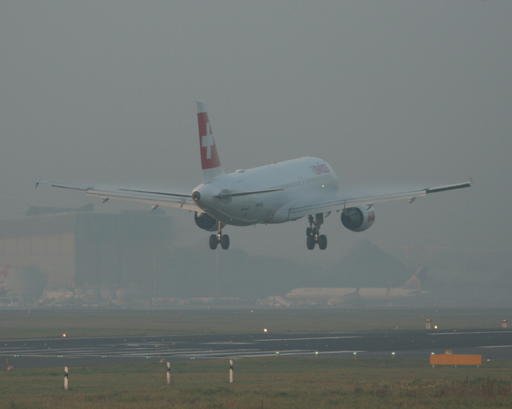 Swiss A 320-214 HB-IJM bei der Landung in Berlin-Tegel an einem sehr trüben Morgen des 29.10.2011