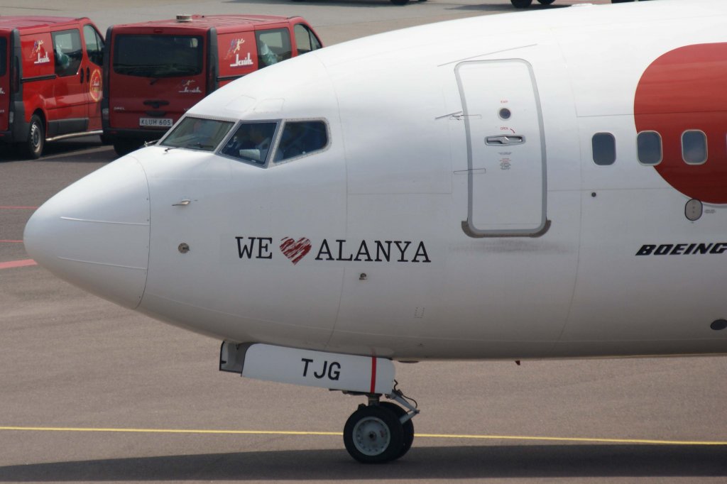 Corendon Airlines, TC-TJG "We love Alanya - Sticker", Boeing, 737-800 wl (Bug/Nose), 25.05.2012, AMS-EHAM, Amsterdam (Schiphol),Niederlande