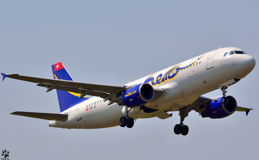 HELLO A320-214, HB-JIZ bei Start aus Maribor Flughafen MBX. /7.6.2012