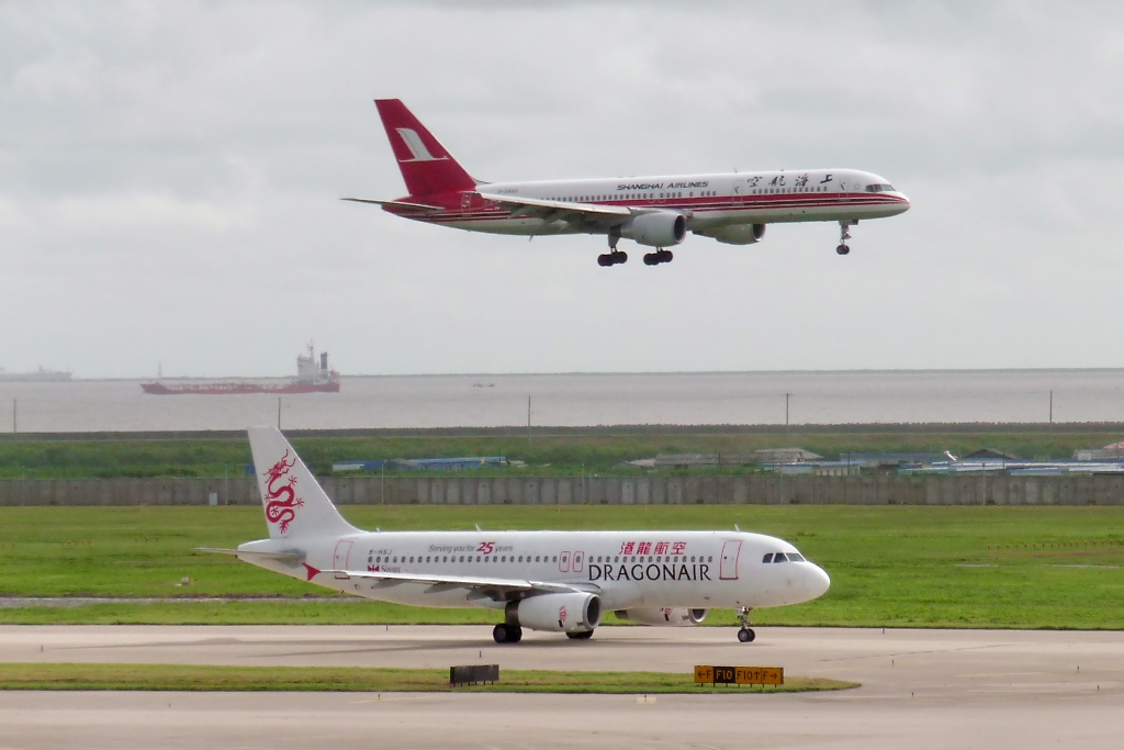 Shanghai Airlines B-2833, Boeing 757-26D, über Dragon Air B-HSJ, Airbus A320-232, in Pudong (6.8.10)