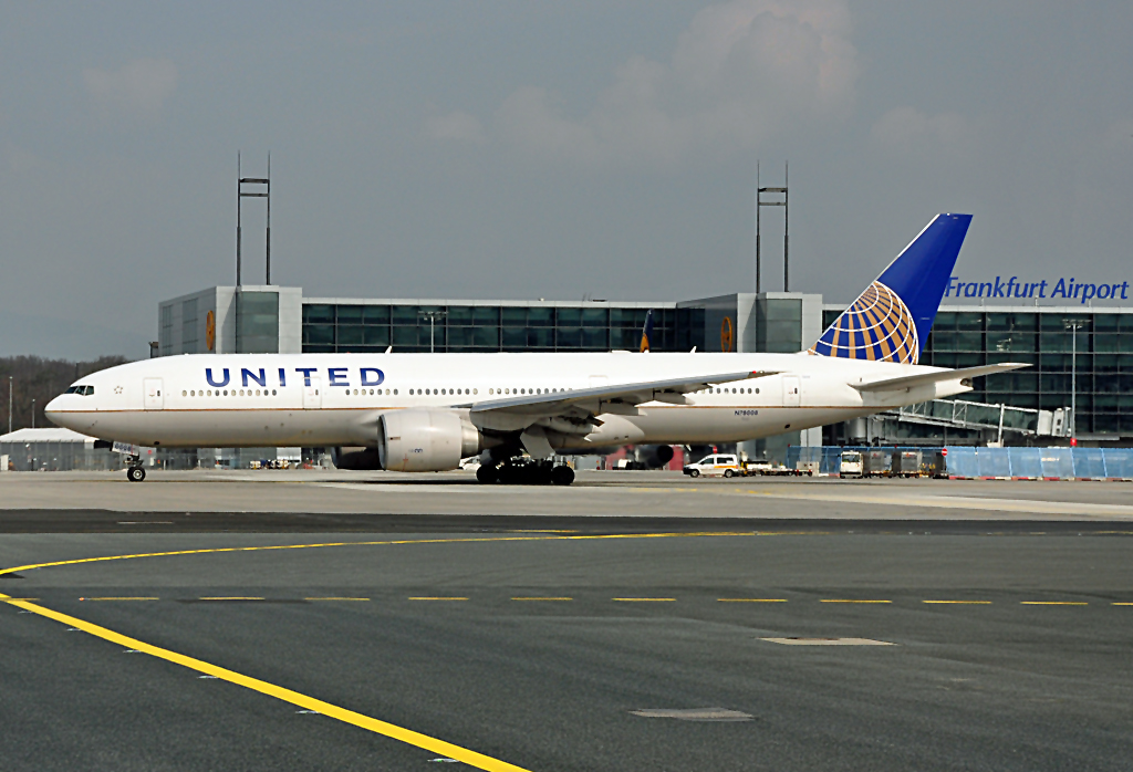 B 777-224 United Airlines N78008 beim Abrollen vom Terminal in FRA - 14.04.2012
