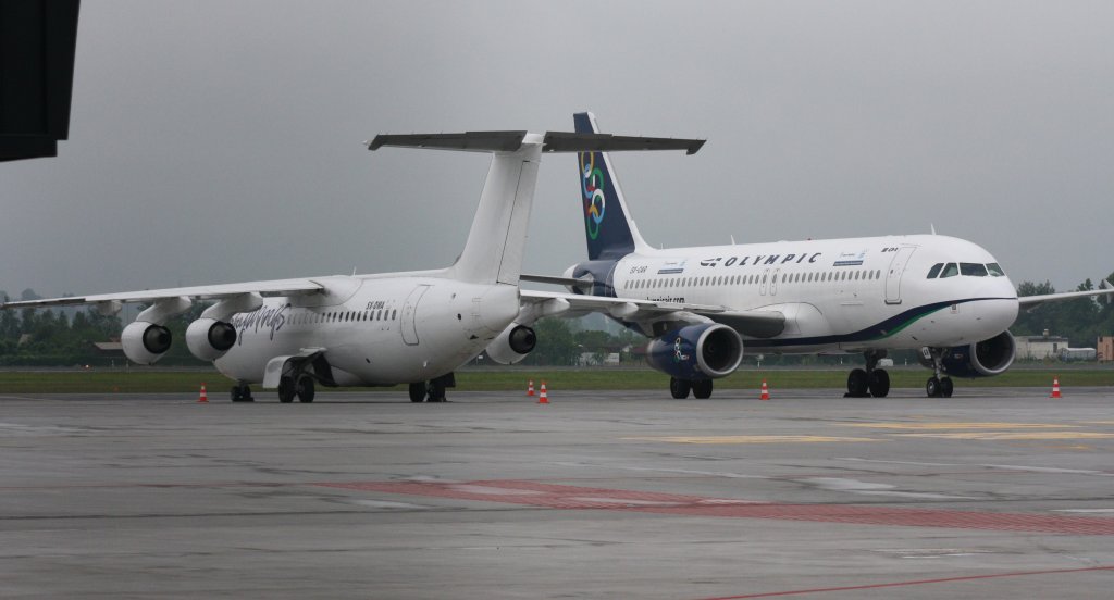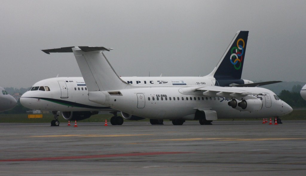 SkyWings,SX-DMA,(c/nE3341),British Aerospace Avro RJ100,22.06.2012,GDN-EPGD,Gdansk,Polen(Hinten Olympic Airlines,SX-OAU,(c/n4193),Airbus A320-214)