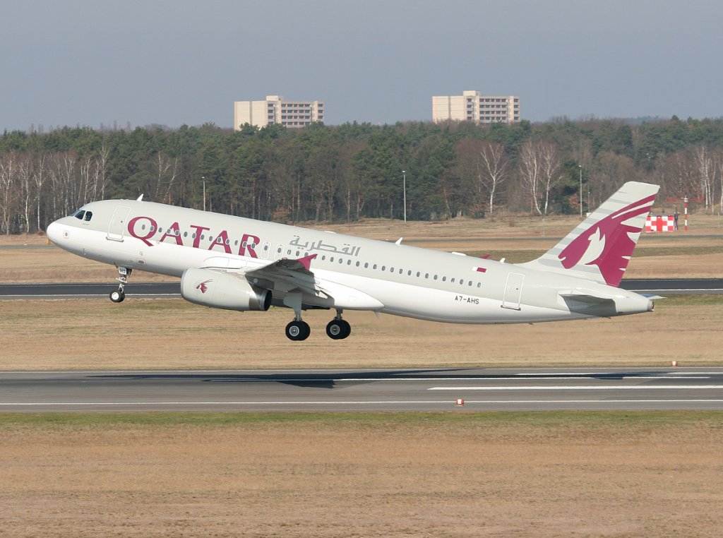 Qatar Airways A 320-232 A7-AHS beim Start in Berlin-Tegel am 25.03.2012