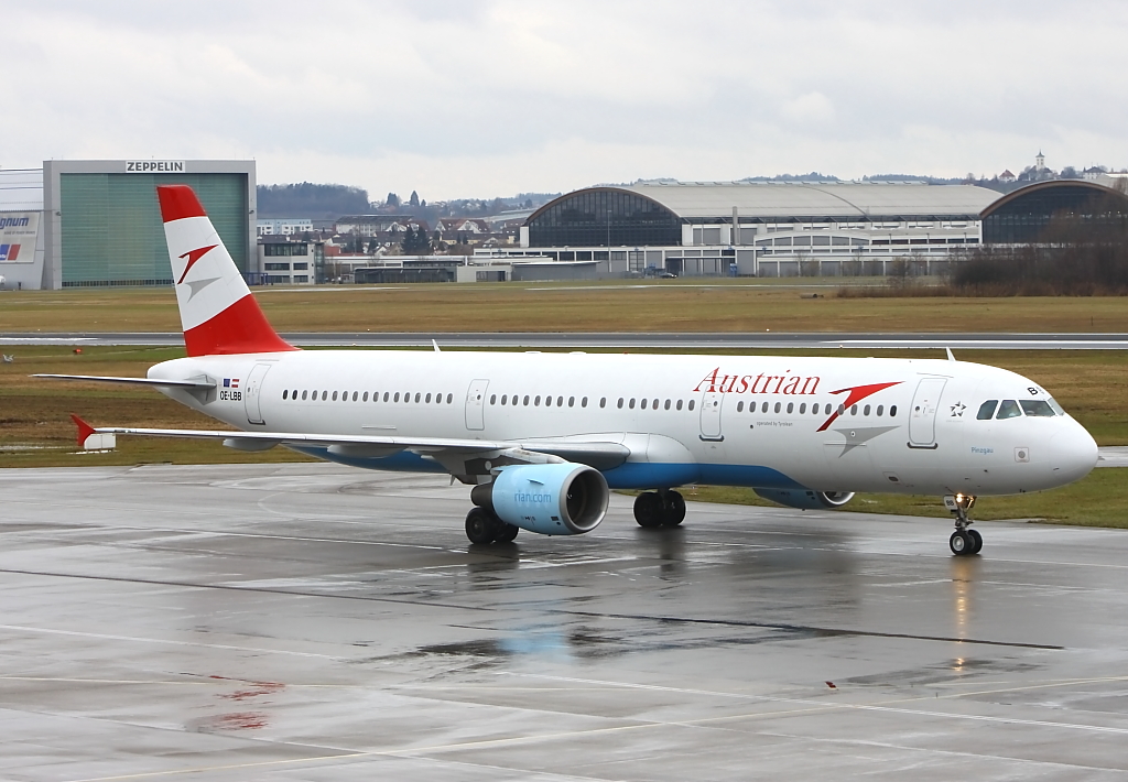 Ausweichlandung in Friedrichshafen, zu sehen ist ein A321 von Austrian vor dem Terminal in Friedrichshafen, (02.02.2013)