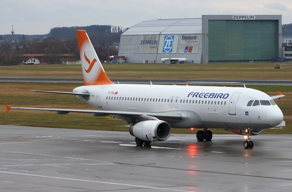 Freebird aus Antalya, der A320 vor dem Terminal in Friedrichshafen, 02.02.2013