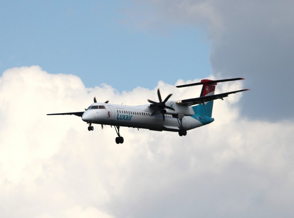 Luxair De Havilland Canada DHC-8-402Q LX-LGD bei der Landung in Frankfurt am Main am 16.08.2012