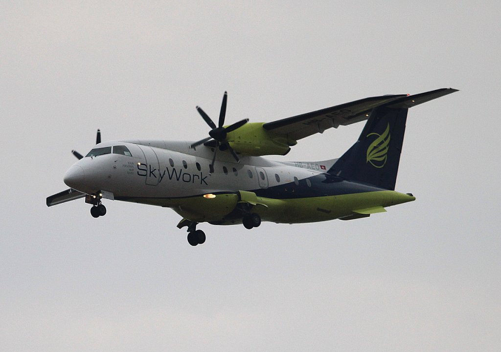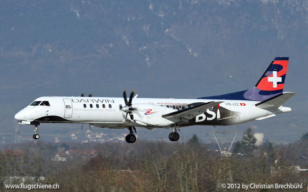 Banker Werbung auf den Darwin Saab 2000 bringt ein wenig Abwechslung in das Farbschema der Tessiner Airline. Hier die HB-IZZ bei der Landung am 29.12.2012 in GVA.