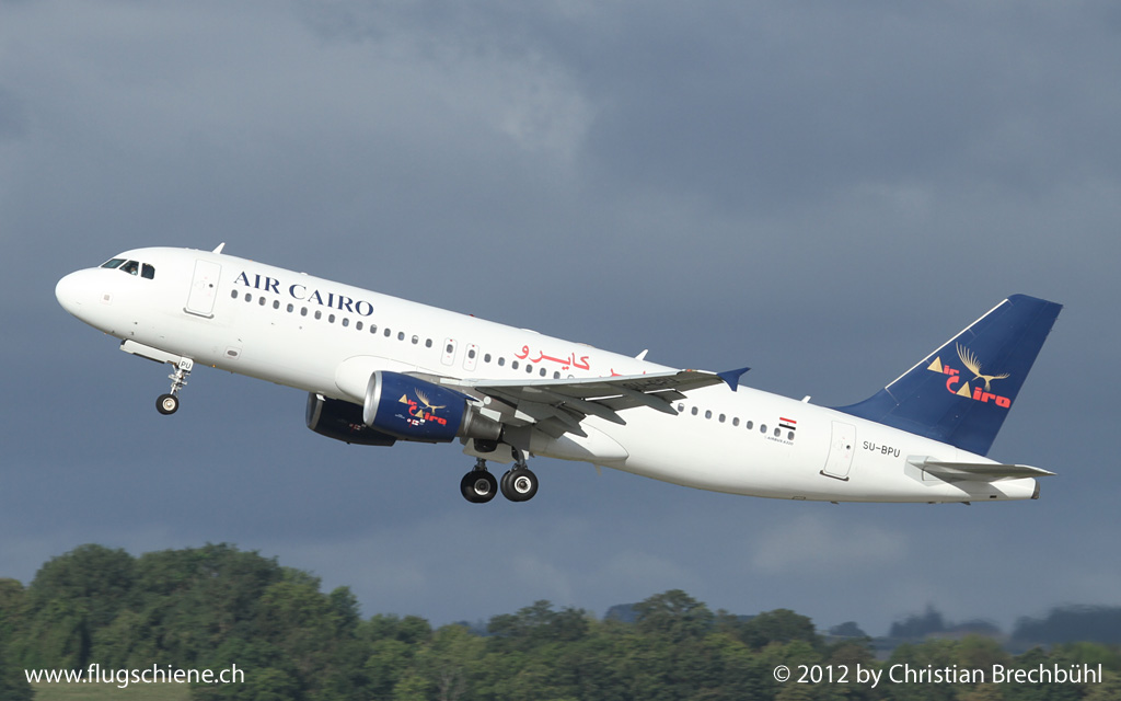 Der Airbus 320 SU-BPU der Air Cairo beim Morgenentlichen Start am 26. August 2012 von BSL in Richtung Hurgada.