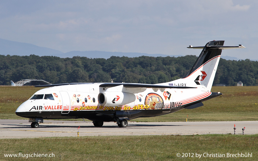 Der I-AIRX Dornier Jet Do-328-300 der Air Vallee mit ihrer farbigen Casino Werbung vor dem Start in GVA am 15. Sept 2012.