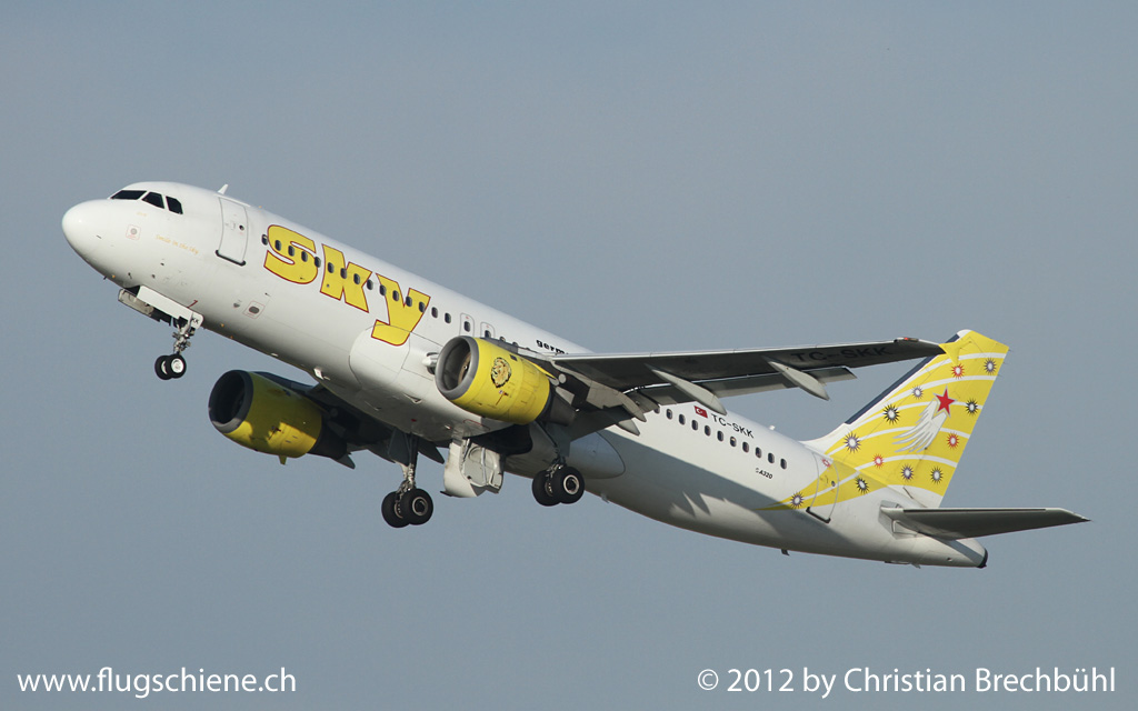Die TC-SKK A320 der Sky ist leider nicht mehr am Fliegerhimmel als aktives Flugzeug zu sehen, hier ist der Gelbe Vogel bei einem seiner letzten Flüge ab BSL am 6. Oktober 2012 beim Takeoff
