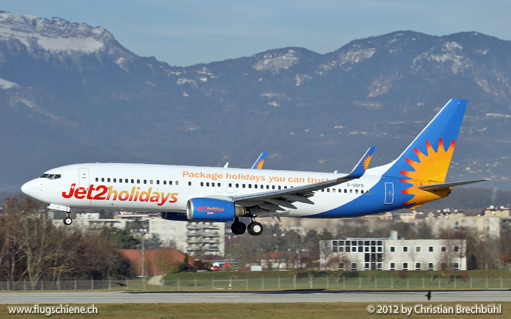 Herrliche Farben auf der Jet2 Holiday Boeing 737-800 G-GDFD bei der Landung am 29.12.2012 im gar nicht Winterlichen Genf.
