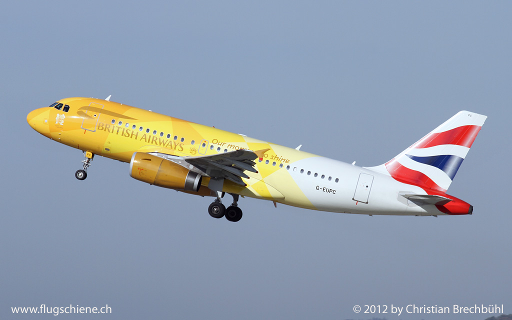 Olympia sei Dank, die Engländer bringen ein bisschen Farbe auf die Airbusse der British Airways. Hier die G-EUPC A319 beim Start in Zürich- Kloten am 20. Oktober 2012.