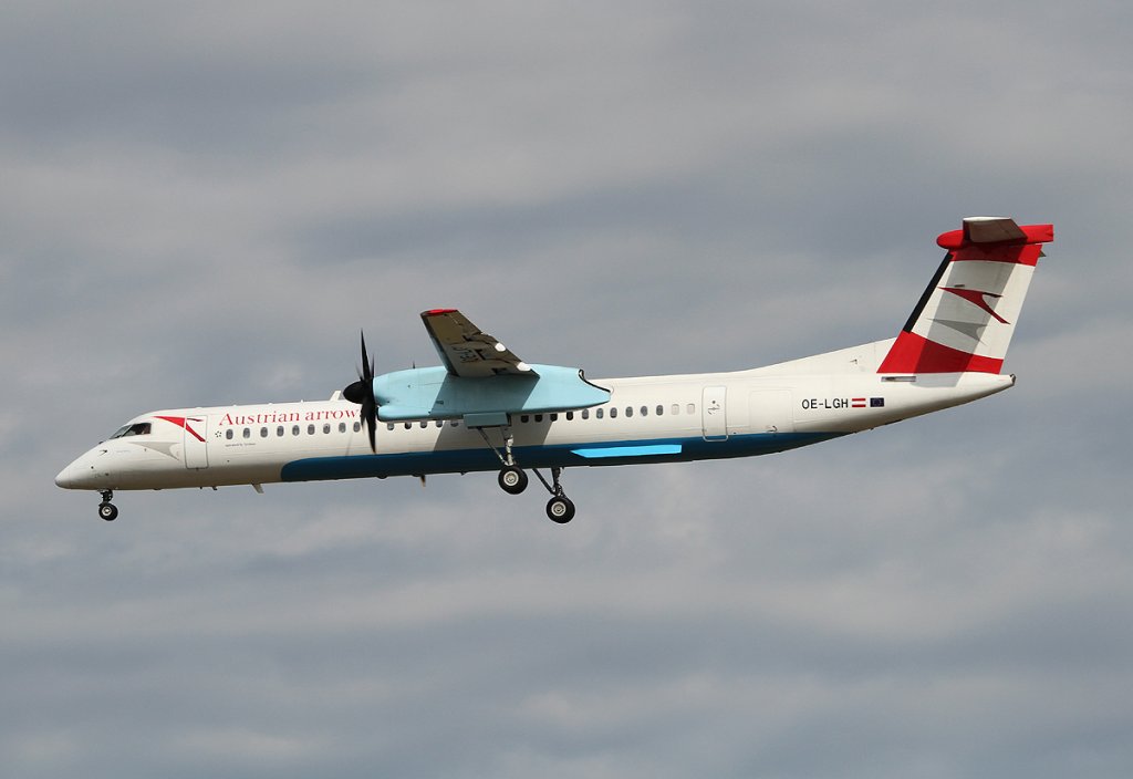 Austrian Arrows De Havilland Canada DHC-8-402Q OE-LGH bei der Landung in Frankfurt am Main am 16.08.2012