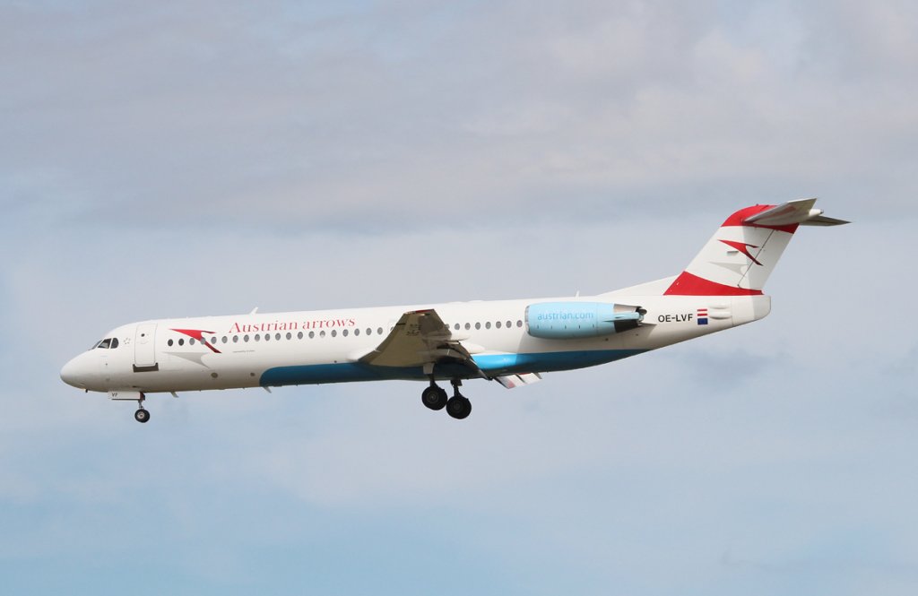 Austrian Arrows Fokker 100 OE-LVF bei der Landung in Frankfurt am Main am 16.08.2012