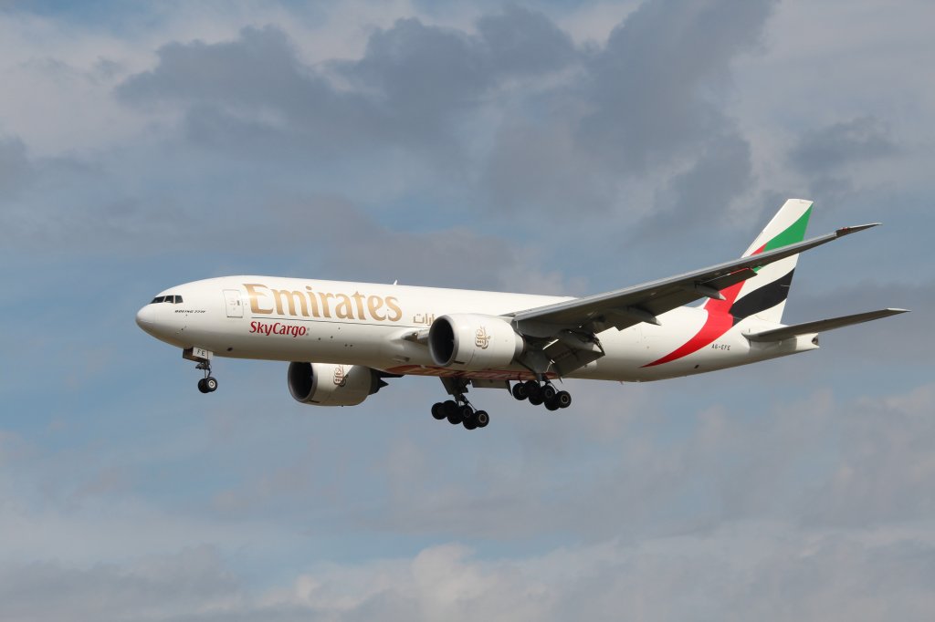 Emirates Sky Cargo B 777-1FH A6-EFE bei der Landung in Frankfurt am Main am 16.08.2012