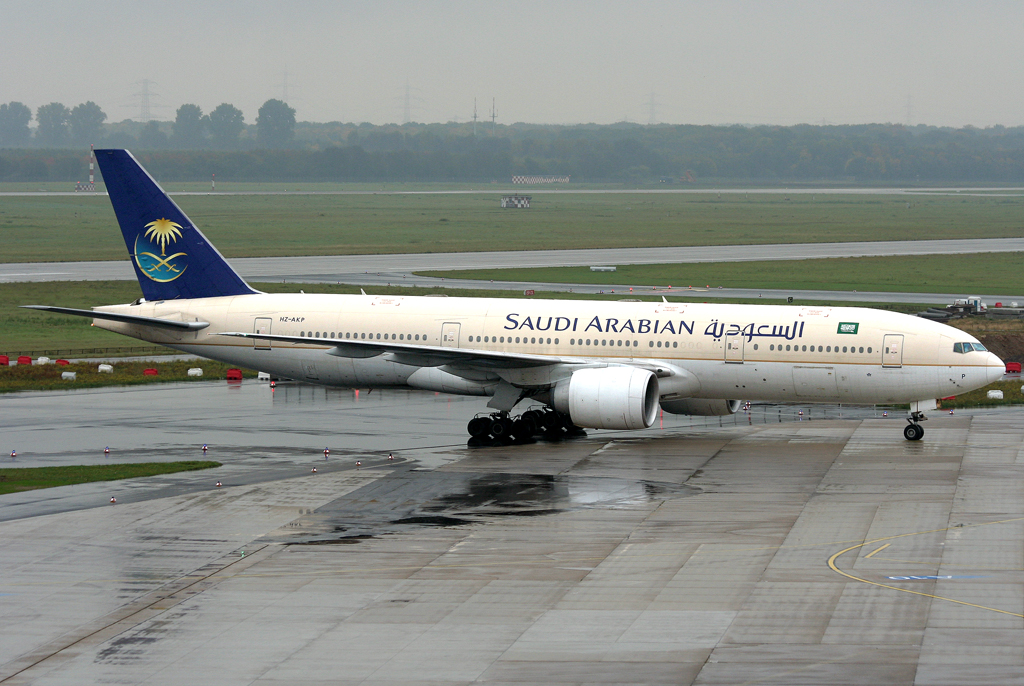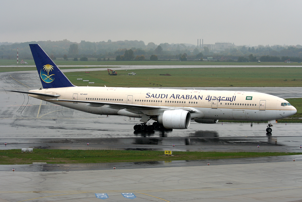 Saudi Arabian B777-200 HZ-AKP rollt zur 23L in DUS / EDDL / Düsseldorf am 08.10.2008